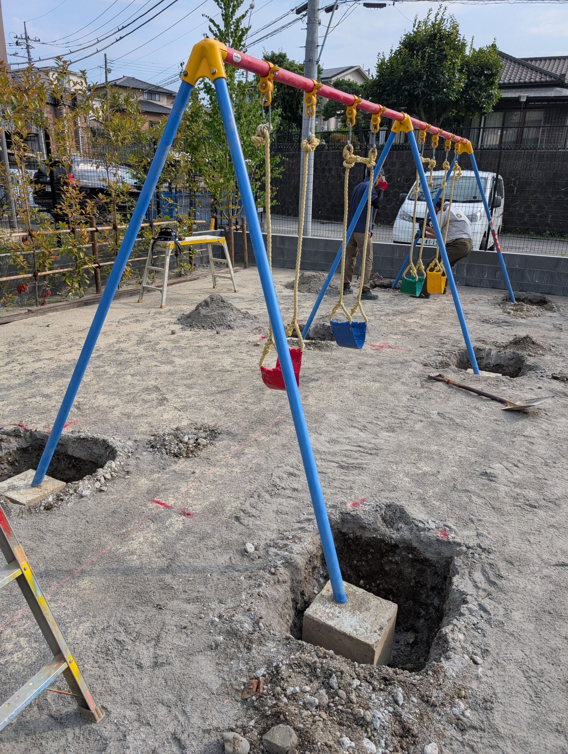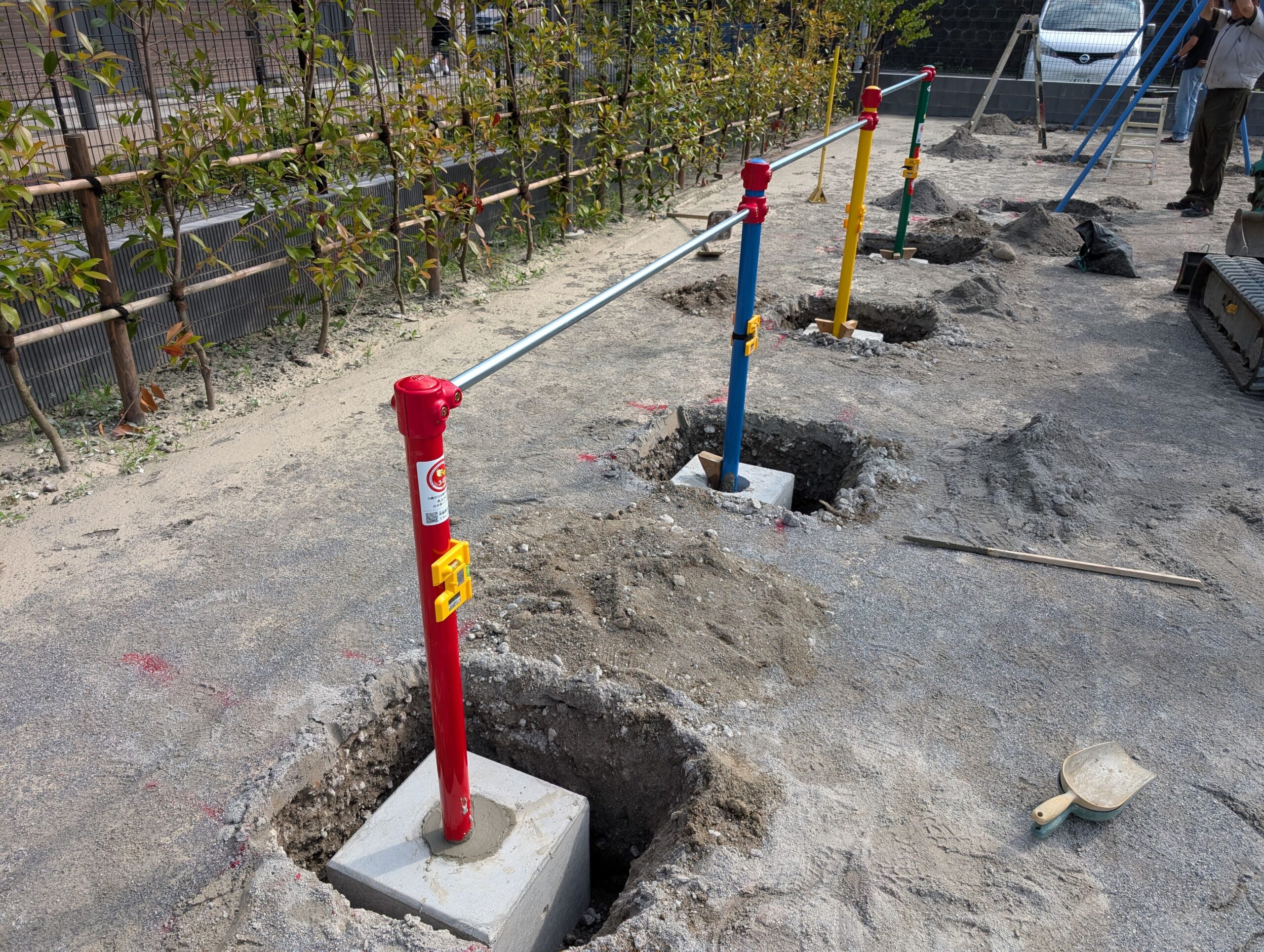 最初に遊具の土台となる基礎をしっかりと作り、その上に新しい鉄棒を組み立てていくのが主な工程です。