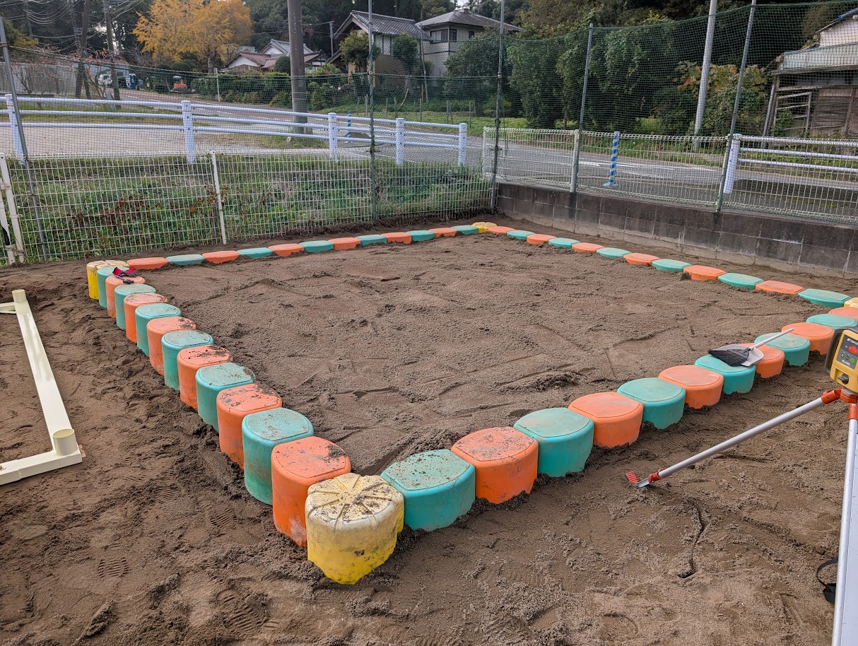 - 砂場エリアの掘削・整地:砂場設置エリアを掘削し、底面を整地。防草シートの敷設と排水処理を施工