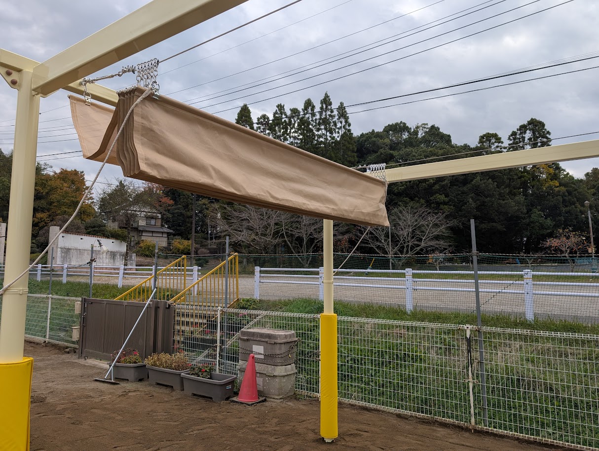 近年、夏場の気温上昇に伴い、保育園・幼稚園の園庭における熱中症対策が重要課題となっています。今回は遊具エリアや砂場の上部にシェードを設置し、強い日差しや紫外線から子どもたちをしっかりと守る環境を整えました。支柱の基礎工事から膜材の取り付けまで、安全性を最優先に施工いたしました。