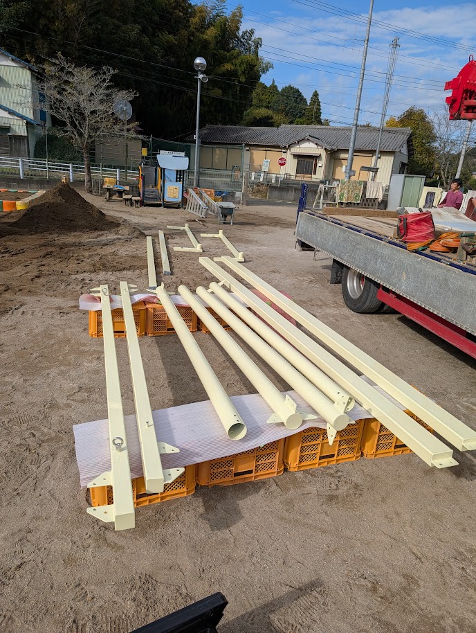 - シェード支柱の基礎工事・設置:コンクリート基礎を施工し、支柱を正確に建て込み